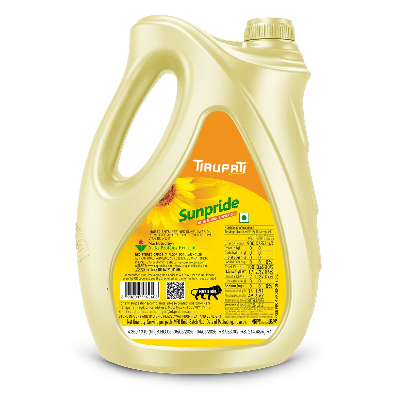 Ingredients: Refined Sunflower Oil, Permitted Antioxidant TBHQ (Food grade).